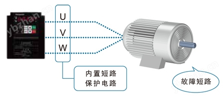 即使因過負載等使電機發生故障,引起短路,VF200 也 會檢測到過電流,通過瞬間斷開輸出來保護電路,因此可 放心使用。