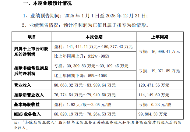 儀表網 行業(yè)財報】1月27日,賽微電子(300456)披露業(yè)績預告,公司預計2025年歸母凈利潤14.1億元至15.0億元,同比增長932%至985%,較去年同期虧損1.70億元實現扭虧為盈;預計扣非凈虧損3.03億元至3.91億元,同比下降59%至105%;預計營業(yè)收入8.07億元至8.40億元,較去年同期有所下降。
